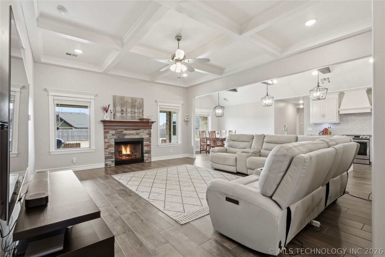Located in the desirable 4-Bar Ranch community, this thoughtfully designed home offers modern style, quality construction, and long-term energy efficiency. Built in 2021 and situated on a 1/2-acre lot, the home provides well-planned living space with 5 bedrooms (or 4 plus office), 3 full bathrooms, and a 3-car garage with storm shelter. The open-concept layout features high ceilings, detailed trim work, and a coffered ceiling in the living room, anchored by a gas fireplace. The kitchen is both functional and polished, offering a large island, granite countertops, high-end appliances, and a spacious pantry. Throughout the home, upgraded wood-look tile flooring and freshpaint create a cohesive, modern feel. The primary suite includes a spa-style bathroom designed for comfort and everyday ease. A standout feature of this property is the solar panel system, providing meaningful monthly utility savings and increased energy efficiency-an increasingly valuable advantage for long-term ownership. A whole-home water softener system adds another layer of comfort and convenience. Outdoor amenities include an extended back patio with brick surround, a fully sodded yard with plush grass, a dedicated garden area, an HOA-compliant shed, and a fully fenced backyard with extended-height fencing. This home blends modern finishes, flexible living space, and smart energy efficiency in one of Collinsville's most sought-after neighborhoods. Assumable veterans loan with low interest rate!