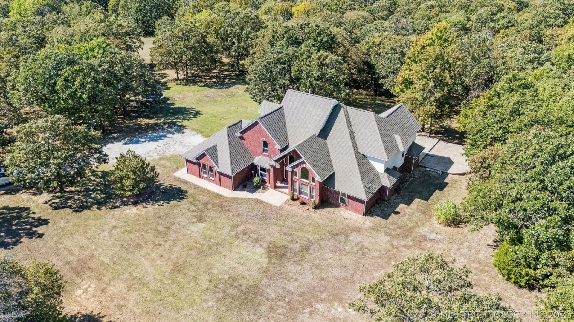 Enjoy peace, privacy, and space in this stunning 5-bedroom, 4.5-bath full brick home nestled among mature trees on a 2.48-acre lot. The FRESHLY PAINTED open floor plan features soaring ceilings, oversized windows, and abundant natural light throughout. The spacious kitchen impresses with high ceilings, generous cabinetry, and an easy flow into the living and dining areas which are perfect for entertaining. A large concrete patio extends your living space outdoors, ideal for gatherings or quiet evenings surrounded by nature. Three bedrooms offer private en-suite baths, providing comfort and convenience for family or guests. Additional highlights include a dedicated office with built-in bookcase, a bonus room downstairs, and a formal dining area for special occasions. Located just minutes from Skiatook and beautiful Skiatook Lake, this home offers the perfect blend of tranquility and accessibility.