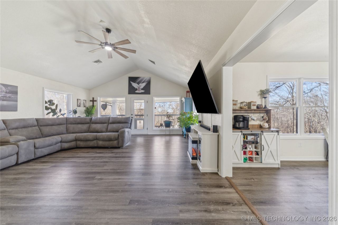 Tucked away at the end of a quiet dead-end street and bordering GRDA land, this two-story brick home offers rare privacy and peace on 2.31 wooded acres. Mature trees, natural views, and a protected setting create the kind of atmosphere buyers search for-but rarely find. The main-level entry opens to a light-filled living space with vaulted ceilings and expansive picture windows, seamlessly connecting the indoors with the surrounding landscape. The remodeled kitchen features updated countertops, new backsplash, new appliances, and a central island, flowing effortlessly into the main living area. The main-level primary suite is a true retreat with two walk-in closets (one with stackable washer/dryer) and a fully renovated bath with granite countertops, dual sinks, jacuzzi tub, and separate tile shower. A second main-level bedroom includes a walk-in closet and access to a Jack-and-Jill bathroom. The lower level (second story) offers a spacious family room with wood-burning fireplace, wet bar, and wraparound picture windows, plus two additional bedrooms, a full bathroom, and a large safe room with interior and exterior access. Extensive high-value improvements completed between September-November 2023 include: new roof, structural stabilization with piers (home leveled), three HVAC systems, three hot water tanks, Generac 24kW whole-home gas generator, and fireplace inspection. Thoughtfully restored and structurally reinforced, this home delivers privacy, views, and lasting peace of mind.