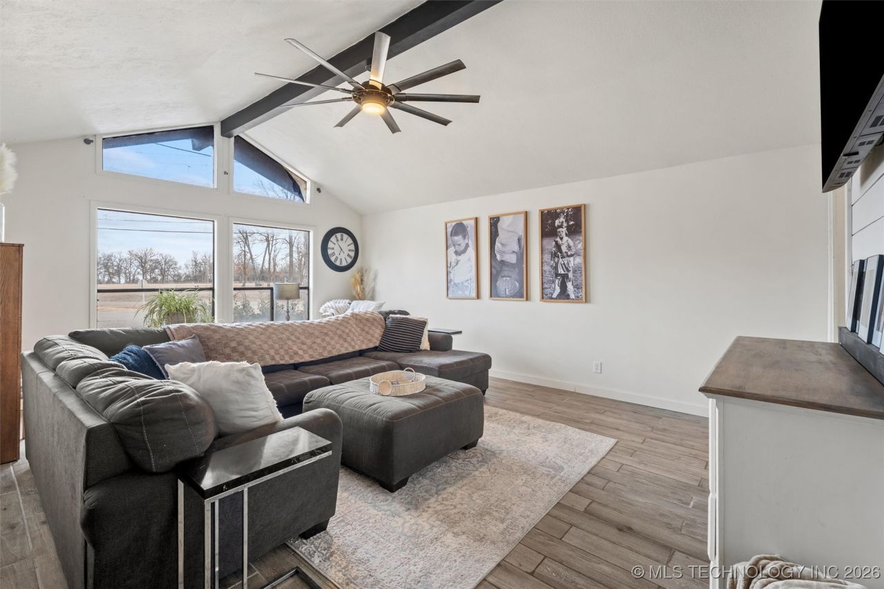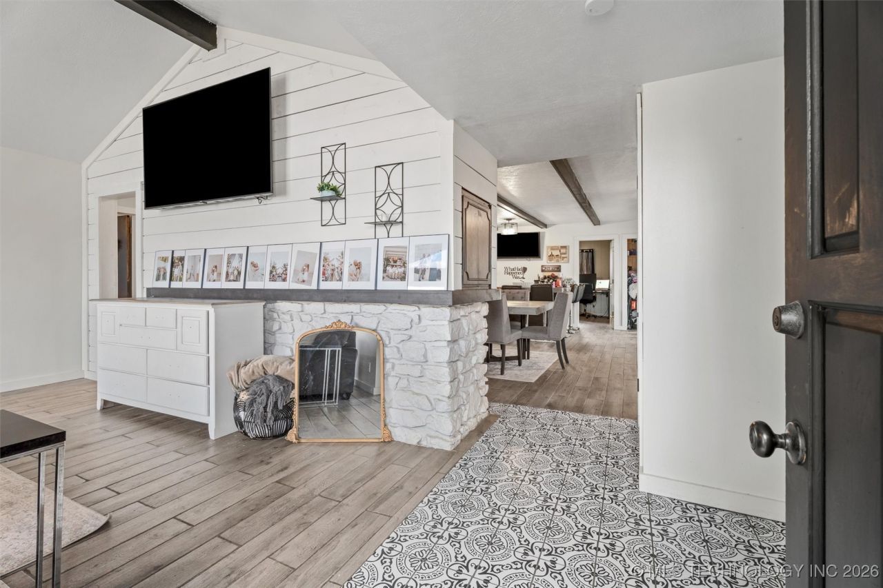 Perched atop a hill on .73 scenic acres in a sought after location, this stunning 5-bedroom, 3 bathroom home offers space, privacy, and unforgettable views. From the moment you walk in, you're greeted by a vaulted ceiling, wall of windows, and a striking double sided wood burning fireplace, that anchors the living room. The converted garage (475 sq ft per CH) adds flexible living area and includes a large built-in bar with seating for seven and a big screen TV-perfect for entertaining guests or hosting game nights. Enjoy wood-look ceramic tile throughout, keeping the home both stylish and low maintenance. The primary suite feels like a spa with a custom shower, soaker tub, and vanity designed to impress. With a new roof being installed before closing, this home is ready for its next chapter-just bring your furniture and start enjoying the view.