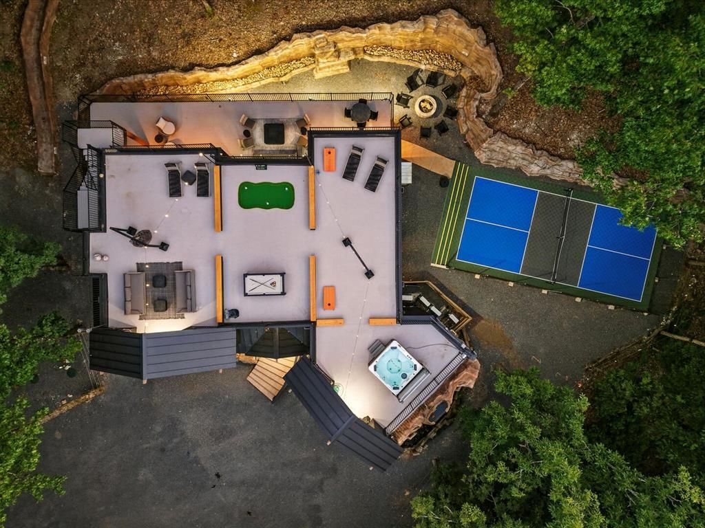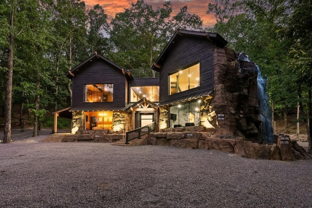 Cave and Cascade - Where Modern Meets Wilderness Perched on the winding mountainside of Cordillera and surrounded by towering pines just outside Beavers Bend State Park and Mountain Fork River, Cave and Cascade is a one-of-a-kind modern escape that perfectly blends rugged nature with refined comfort. This stunning three-story retreat sleeps up to 24 guests and was thoughtfully designed for unforgettable gatherings, peaceful getaways, and elevated outdoor living. Step inside and experience interiors reminiscent of a tranquil cave-refreshing, soothing, and elegant-featuring luxurious high end finishes, organic textures, and contemporary design elements that whisk you away from the everyday. The home features four king bedrooms, including two with private en suite baths on the lower level and a shared en suite upstairs. A spectacular cave-themed bunk room and an additional upstairs bunk room provide flexible sleeping options for larger groups.Every level offers a curated outdoor experience, The rooftop deck is a true entertainment haven, boasting a hot tub, putting green, TVs, outdoor pool table, and hammock swings-all set against breathtaking forest and mountain views. A cascading rock waterfall flows along the cabin's side, creating a tranquil soundtrack for your stay. Enjoy al fresco dining at the state-of-the-art grilling station, gather by the cozy fire pit, or challenge friends to a game on the pickleball court. There's even a dedicated doggy room, so furry family members can vacation in style.Inside, a moody bar and game area set the tone for evenings of fun and connection-complete with poker table, shuffleboard, and gaming table. The open-concept living room offers soaring ceilings, a gas fireplace, and panoramic mountain views. A chef's kitchen with premium appliances and an oversized dining area make entertaining effortless.With unmatched amenities, breathtaking views, and luxurious comfort, Cave and Cascade is more than a cabin-it's an experience.