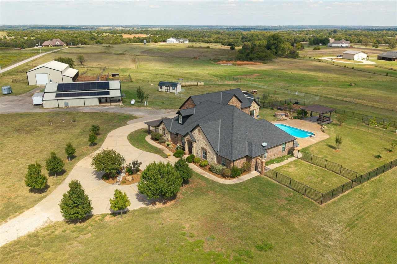 Pass through the gated entry and be welcomed onto this exceptional 17.7-acre homestead. The main residence features a gourmet kitchen with custom cabinets, marble counters and walk-in pantry. Gather in the living room with custom fireplace and cabinetry. The intimate primary suite has a fireplace, his-and-her closets, jetted tub, dual walk-in shower, and double vanity. 2 additional bedrooms on the main floor and 3 bedrooms upstairs, this 2-story layout is designed for comfort and flexibility. Extra-large closets in 2 upstairs bedrooms can be used as craft room, study space or storage. The large laundry room features 2 washers, 2 dryers, and farm sink. A detached gym is located between the main house and pool. An outdoor kitchen has granite countertops, sink and gas hookup for a grill. Enjoy cool weather around the stone fire pit overlooking the farm and amazing views for miles. A second home?beside the shop?is a cozy 2 bedroom, 1 bathroom, with full kitchen, laundry room/pantry, and views of the farm. An ideal space for guests or multi-generational living. A 20x30 section of the shop connects to a 20x27 section with overhead doors for vehicle storage, and a workspace. The property also features a 40x70 barn with concrete floors, spray foam insulation and four 12x12 stalls with Dutch doors leading to pens with awnings, 2 climate-controlled storage/feed/tack rooms, milking room, full bathroom, and 14x14overhead doors. Additional features include 2 water wells enclosed in an insulated shed, cross and perimeter fencing, raised-bed garden, fruit trees, and large chicken coop. The land is 95% pasture with native grass and 2 ponds. Security consists of a custom alarm system, cameras and automatic locking front gate. Off-grid capability from 15kW panels, Sol-arc inverters, 62kwH batteries supported by a Wildcat generator that operates the whole property. This is a turnkey opportunity for anyone seeking a self-sustaining lifestyle with modern comforts.