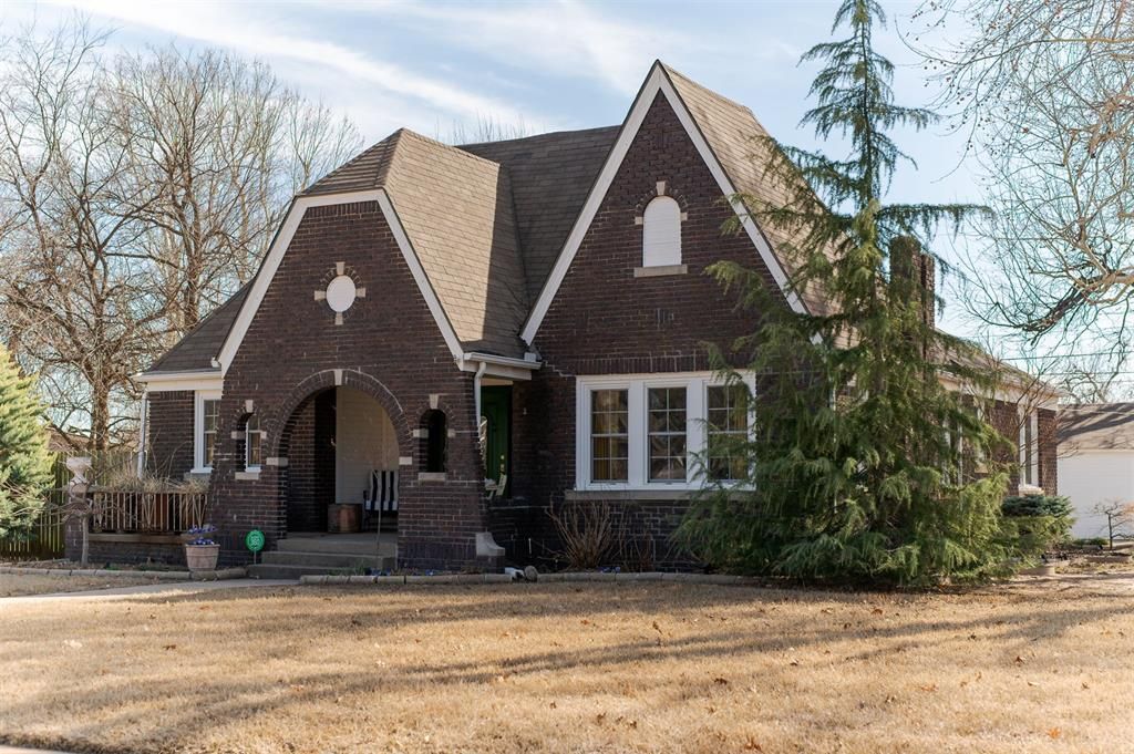 Set on an oversized corner lot in historic Linwood Place, this Tudor Revival pairs classic architecture with meaningful updates. Steep gables, an arched entry, and traditional brickwork create inviting curb appeal, framed by established perimeter landscaping that gives the home a strong presence from the street. Inside, a vaulted living room filled with natural light showcases warm wood beadboard ceilings and beautifully maintained hardwood floors. Updated to complement the home's character, the kitchen offers white cabinetry, granite countertops, stainless appliances, and a peninsula that opens comfortably to the dining area. Just beyond, a wood deck extends the living space outdoors, creating an easy setup for grilling, dining, and gathering while overlooking the deep backyard. Flexible living options include two bedrooms plus a study currently used as a bedroom, offering versatility for guests, office space, or additional living needs. French doors in the primary suite open to the rear addition, now serving as an expansive closet and upstairs laundry space with built-ins. This area presents clear opportunity for a future owner to further tailor or expand the suite over time. Major improvements include Pella windows and updated electrical (2012), roof (2012), HVAC (2018), renovated bathrooms (2022), relocation of the laundry from the basement to the main level (2022), and a new hot water tank (2025). Positioned on over one-third of an acre, the corner setting allows for generous yard space and added flexibility. A detached two-car garage is complemented by an additional drive pad for extra parking, and quick access to I-40 and I-44 allows for easy connections to downtown and nearby hospitals. Schedule your showing today!
