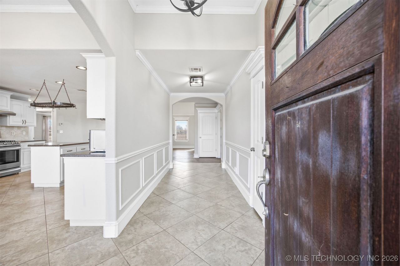 Beautifully designed 4-bedroom, 3-bath, plus Office located in Skiatook ~ Cooper Landing. Offering peaceful and serenity, views. This thoughtfully laid-out home features two primary suites, ideal for multi-generational living. The main level primary suite includes a soaker tub, walk-in shower, and a spacious walk-in closet. Upstairs, a versatile flex/media room with an attached bathroom creates a second primary bedroom option. High ceiling office space with large windows & custom trim. The open living spaces are designed for comfort and functionality, while the 3-car garage is equipped with a storm shelter, shop-vac system, garage shelving and cabinets remain with the sale, offering excellent storage and workspace. Covered back patio with two ceiling fans, large fenced in yard. Additional features include a whole-house water softener. Enjoy space, flexibility, and peaceful living-this home truly offers it all. Private gate entry to community pond where you can catch and release. Trunkey Move In Ready!