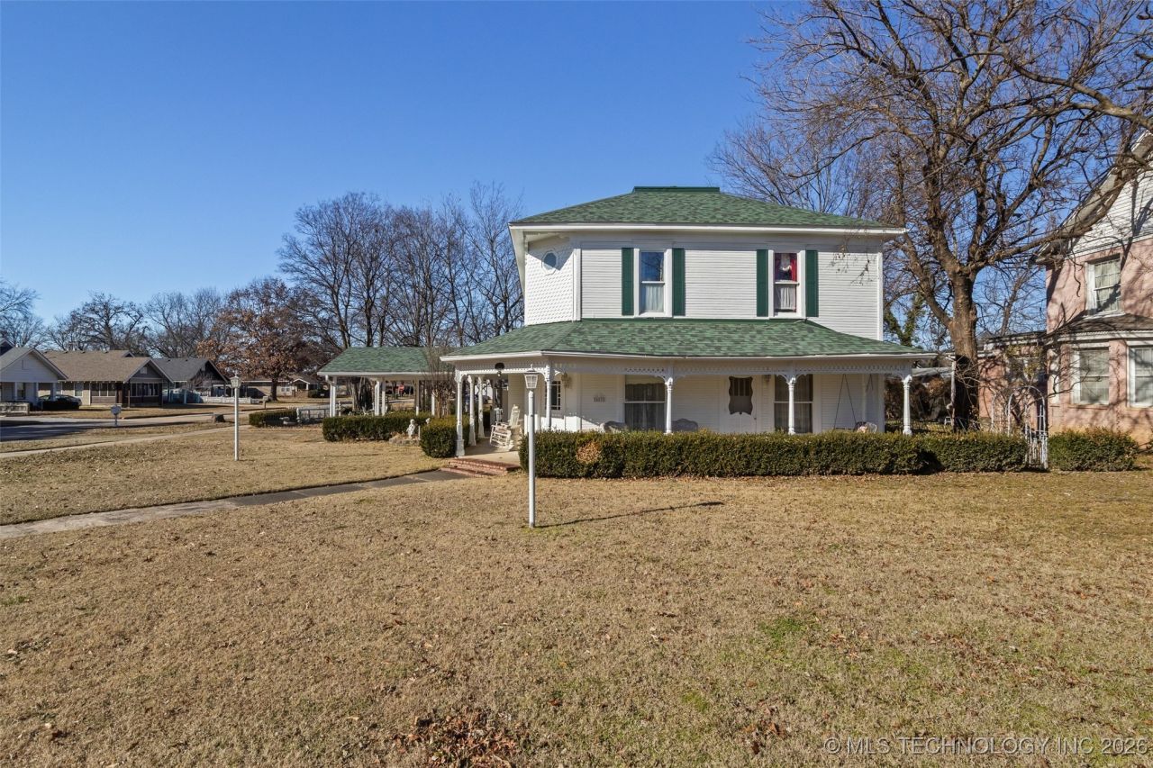Own a piece of Claremore history with this ornate 1904 Victorian home that sits on a spacious corner lot and retains much of its original character, highlighted by one-of-a-kind gingerbread woodwork. The interior reflects the Victorian era throughout its generous layout, featuring 4 bedrooms, 2.5 bathrooms, a dedicated office, and a sunroom. Designed for both daily living and hosting, the home includes formal living and dining rooms that flow naturally into the living spaces. Recent updates include a new roof in May of 2025 and fresh exterior paint. Outdoor living options further enhance the property, making it an excellent choice for a primary residence or a uniquely themed short-term rental. This is a rare opportunity to own a well-maintained historic home in the heart of town. Chandeliers in the garden room and black decorative fence do not convey. Column at the top of the stairs, towel bar with 4 hooks and corner cabinet in the first floor bathroom do not convey.