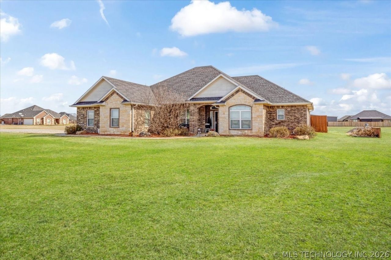 Luxury country living just minutes from Lake Durant and Choctaw Casino, this custom-built brick home on 2 acres offers high-end finishes, thoughtful design, and a peaceful rural setting with convenient access to town. This 4-bedroom, 2-bath home features cathedral ceilings, bullnose corners, and an elegant entry leading into an open-concept living and kitchen floorplan designed for entertaining. The kitchen showcases granite countertops, custom cabinetry, and abundant storage while opening seamlessly into the main living area. The private primary suite includes exterior deck access, his-and-her walk-in closets, double granite vanities, and spa-style tiled walk-in shower with multiple body spray jets. A tankless hot water system provides energy efficiency and continuous hot water. A double glass-door room off the main living area offers flexibility for a home office or formal dining space filled with natural light. The fourth bedroom includes a closet and can function as a guest room, exercise room, or bonus space. Two additional bedrooms are located on the opposite end of the home and each feature walk-in closets. Additional improvements include a two-car garage, covered front porch, covered back patio, landscaped yard, and a shop with concrete flooring and electric. The laundry room features built-in pantry cabinetry, granite folding counter space, hidden ironing board, and additional storage. Enjoy a quiet rural feel while being located less than one mile from Lake Durant with fishing, walking trails, disc golf, and park amenities, and only minutes from shopping, dining, and entertainment in Durant.