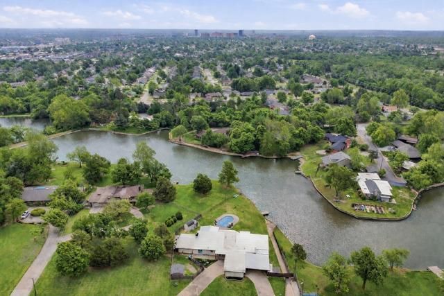 Stellar Mid-Century ranch home situated on a .61-acre lot with a sparkling in-ground pool and private boat dock on a shared lake! This unique property offers a flexible floor plan with 4 bedrooms and two spacious living areas-or the option for 5 bedrooms. Two potential primary bedrooms, each with en suites and large walk-in closets, are thoughtfully positioned for privacy within the home. In the main living room, note the four stunning floor-to-ceiling windows (9' x 4'6 each) providing panoramic view of your own private oasis. Enjoy the expansive covered patio (30' x 20) with vaulted ceiling, custom in-ground pool (heated for year-round enjoyment), and a lush backyard that leads to the sparkling lake, & dock. Note the showpiece fireplace with attractive stone, wood mantle, custom ceiling fan & rich wood look tile flooring. An accent wall opposite the windows hides 3 different storage closets! The kitchen offers a large walk-in pantry and double ovens. Your optional primary suite showcases striking floor-to-ceiling windows and a private walk-out deck, rich wood panel ceiling, wood look tile flooring, a spacious walk-in closet & a beautifully renovated bathroom featuring modern tile, gorgeous walk-in shower with seating, and a full-body sprayer system! This amazing room is self-contained with its own ch&a unit and a tankless water heater. The second primary suite features a private covered patio overlooking the backyard! An in-ground 10-12 person safe room is conveniently accessed from a secondary bedroom closet. The circle drive offers access to a rare three-car pull-through garage, a two-car carport, and an oversized shop! The shop features pull-through 9'x10' doors with driveway entrance & second rear door to the backyard. Ideal for a boat, or even installing a lift for vehicle work. Three storage sheds-two in the backyard and one in a separately fenced side yard. This one-of-a-kind property offers countless features rarely found in a single home.