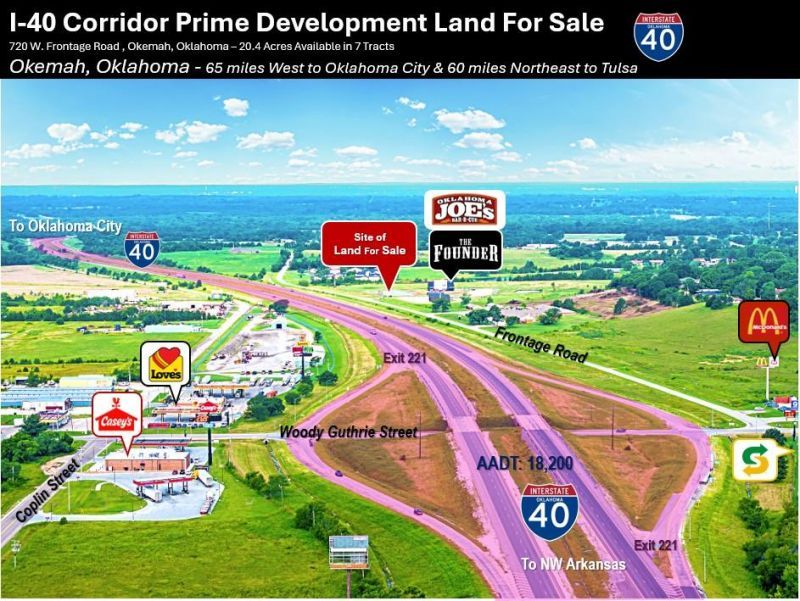 Outstanding opportunity to own the premier 6-acre tract along the I-40 frontage road in Okemah, Oklahoma. This new development offers unmatched visibility between Tulsa and Oklahoma City, with Fort Smith, Arkansas just 100 miles east-an ideal location to capture travelers, commuters, and regional traffic. With 18,500 vehicles per day (AADT), this site is perfectly positioned for high-exposure growth. The property is level at grade with mixed soil types, making it development-ready. A new access road will be constructed to ensure easy entry from the frontage road. Additional acreage-up to 20 acres total-is also available, giving buyers flexibility to scale projects as needed. Directly neighboring The Founder - Oklahoma Joe's, one of Oklahoma's most popular barbecue destinations, this site benefits from a built-in customer draw and brand recognition. Whether you're envisioning a new retail center, light industrial building, farm and ag store, flex-based supply chain hub, or fleet storage facility, the visibility and access along Interstate 40 are unmatched. Okemah's newest anchor-The Founder by Oklahoma Joe's-has already established momentum, creating a natural hub for expansion and complementary businesses. With frontage, size, and strategic placement, this property is an excellent fit for retail, commercial, or service-oriented developments such as a farm and ranch retailer, hotel, UTV/ATV dealership, outdoor equipment dealer, or regional supply chain operator. With strong interstate traffic, local community support, and a high-profile neighbor, this 6-acre tract represents a rare chance to secure a prime location in a fast-emerging commercial corridor. Additional land is available, making this the perfect site for investors and developers ready to be part of Okemah's next chapter of growth. Give us a call from 1.4 acres to 20+ acres available for your diverse needs!